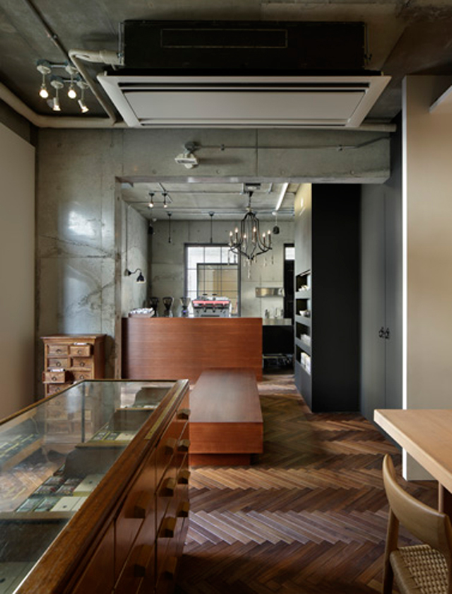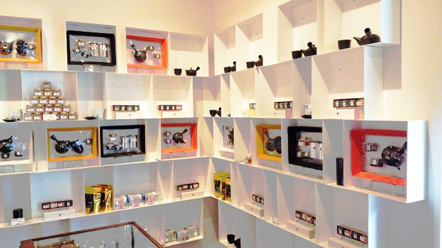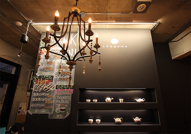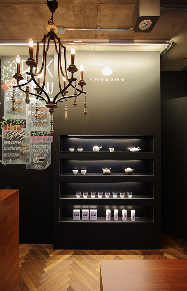 販売するお茶をとりまく色々なアイテム、それにお茶をエスプレッソマシーンで抽出し煎茶ラテや抹茶ラテ、煎茶エスプレッソなどなど、パソコン上で作られたグラフィックのような店内もとてもお茶屋さんとは思えないカフェスペースです。